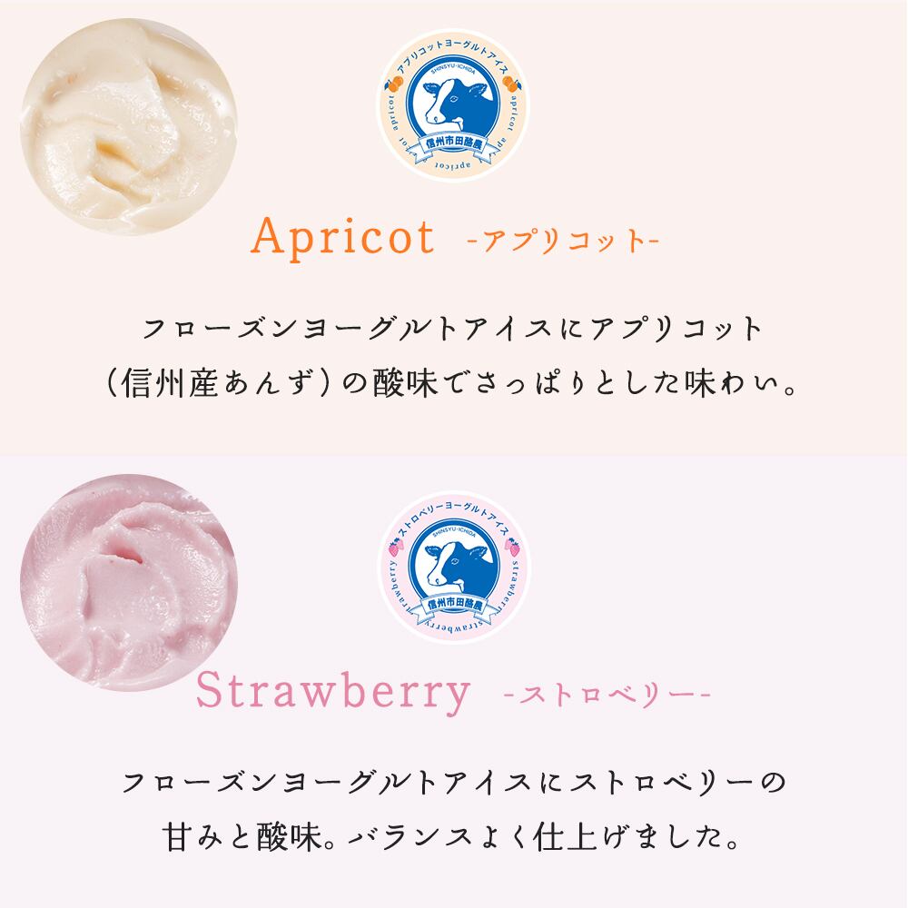 ヨーグルトアイスと相性抜群の爽やかな果実を使用。さらにブルーベリー・アプリコットは信州産を使っています。